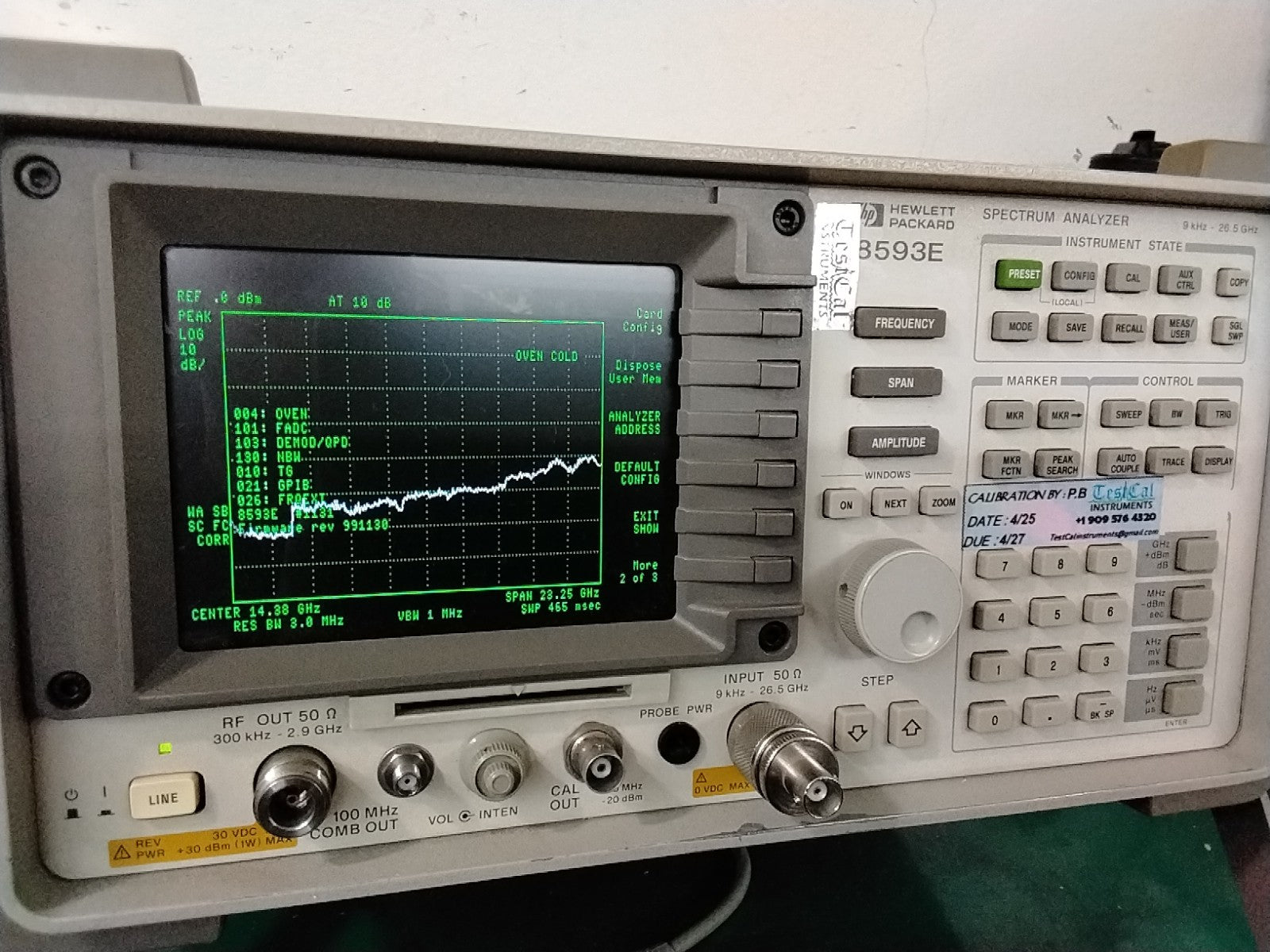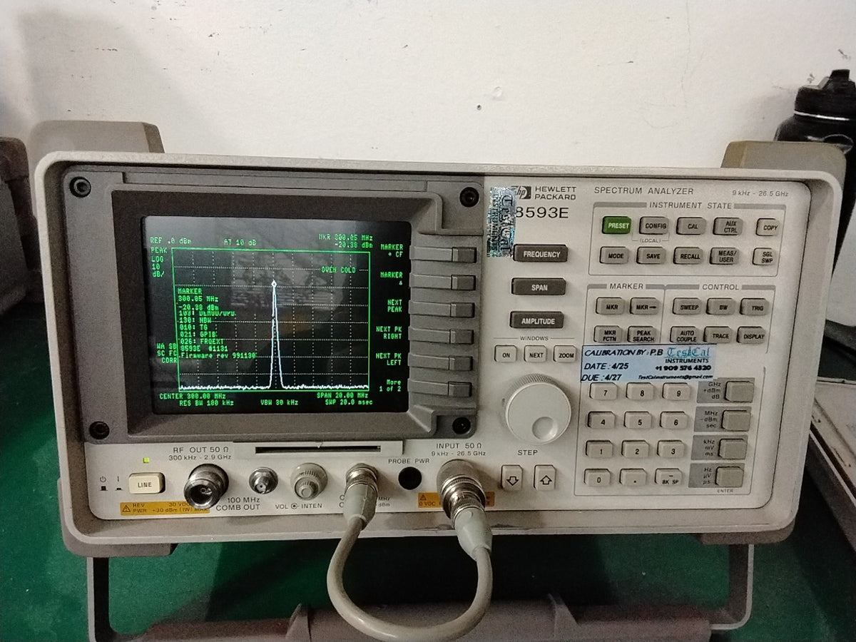 This is a modified 8593E to include an EMC Measurement system. This is a drop in replacement for an 8593EM. Doesn't include the measurement personality card, but includes EMC setups, limit lines,and correction factors. Includes lifetime reinstall of personality and/or quasi peak detector driver in case of battery failure. Weve been in the game for 25 years and will be in it for another 20 yrs !