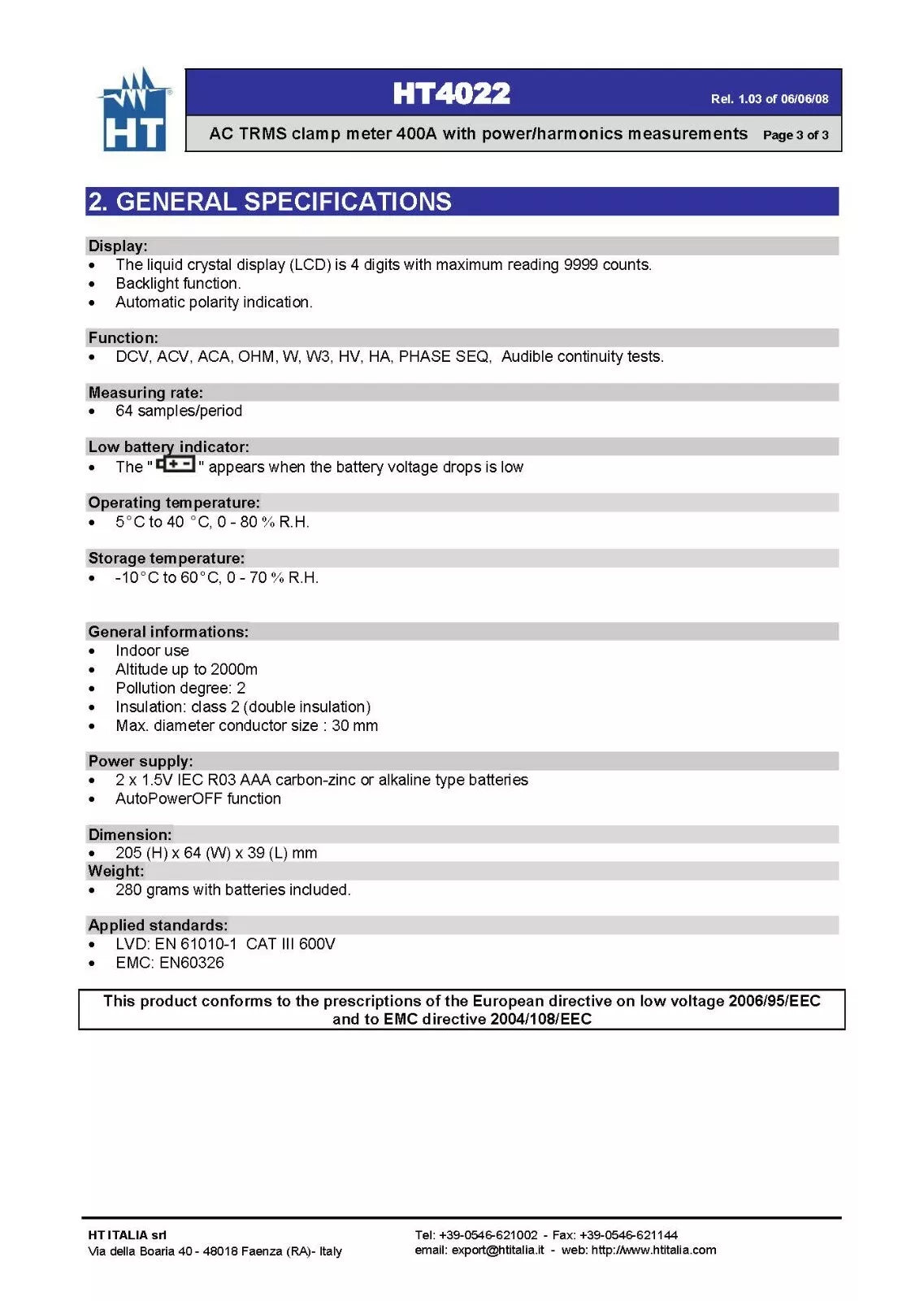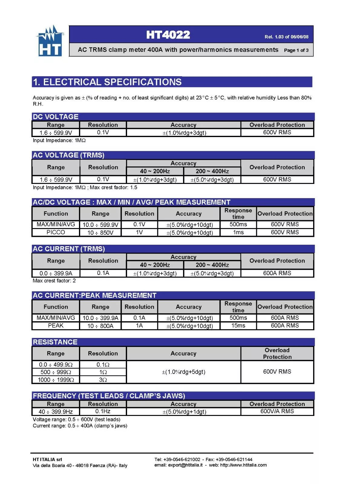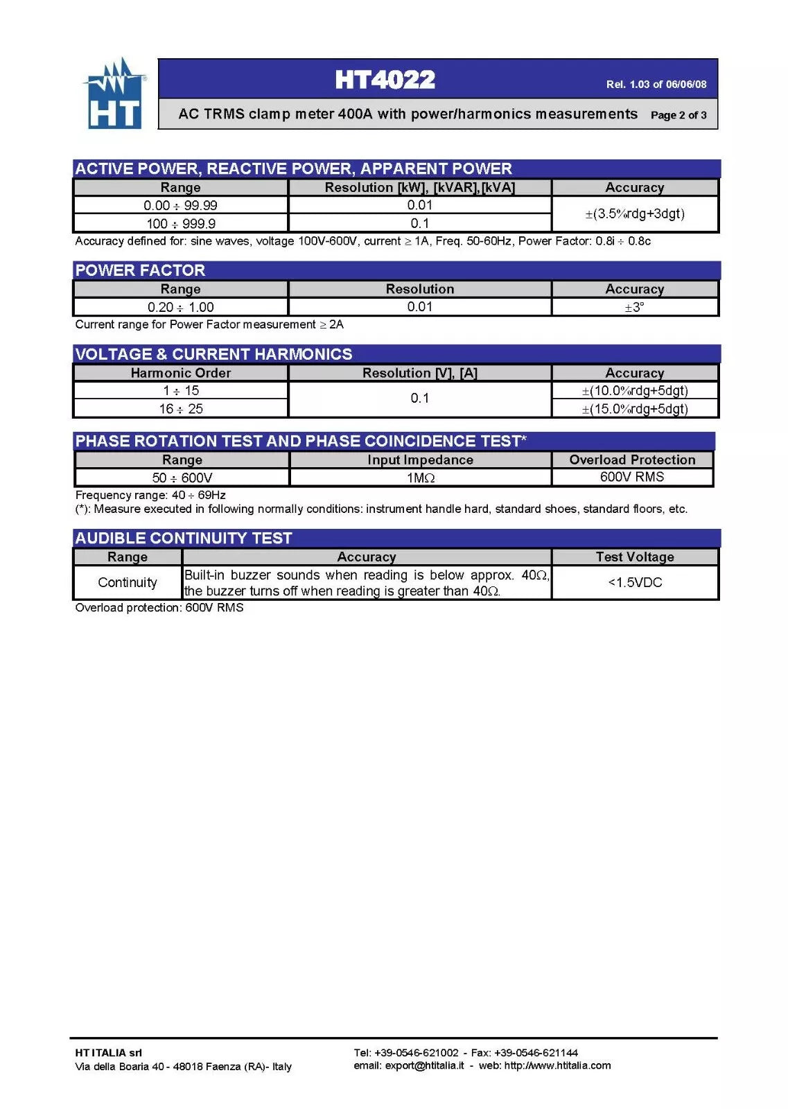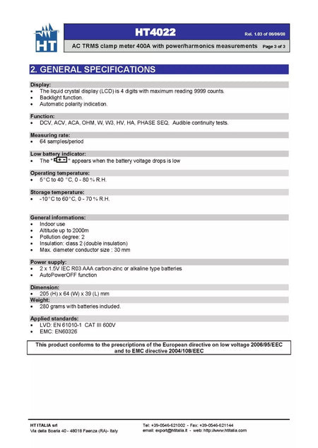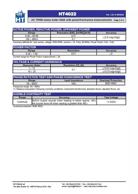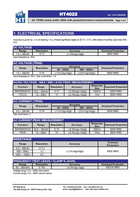 - We have 3 units of HT Instruments HT4022 Pro Clamp Meter AC TRMS 400A with Power/Harmonics Measure. Pictures shown are for reference; we ship randomly. Please contact us for real product images.