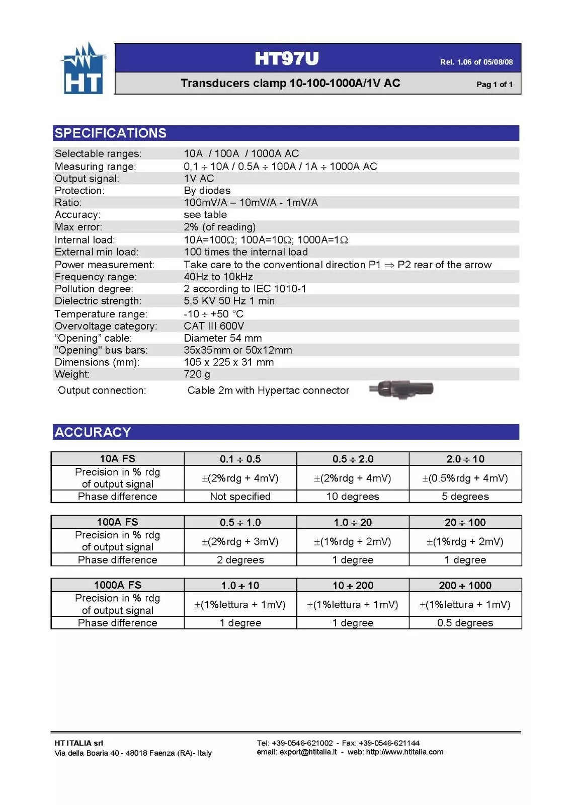 - We have 6 units of HT Instruments HT97U Transducer for AC Current 1000A AC CAT III 600V. Pictures shown are for reference; we ship randomly. Please contact us for real product images.